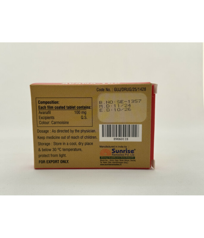 Купить AVANA 100: идеальное решение для быстрого восстановления мужской силыAVANA 100 – современный препарата, который по своей эффективности сопоставим с такими известными средствами, как Виагра, Сиалис и Левитра, но при этом обладает рядом существенных преимуществ. Ключевым достоинством AVANA-100 является его максимально быстрое действие, что делает его предпочтительным выбором для мужчин, стремящихся к оперативному результату. Многочисленные клинические исследования и практический опыт применения подтверждают минимальную вероятность развития побочных эффектов. Данный дженерик препарата Стендра производится индийской фармацевтической компанией Sunrise Remedies.Фармакологические аспекты действия AVANA 100Основным действующим веществом препарата является аванафил, содержащийся в каждой таблетке в дозировке 100 мг. Данная концентрация активного компонента обеспечивает достижение устойчивой эрекции, необходимой для полноценного полового акта.Действие AVANA 100 проявляется уже через 15 минут после приема, а продолжительность эффекта варьируется от 4 до 6 часов. В течение этого времени мужчина способен к естественному совершению полового акта. Благодаря фармакологическому воздействию аванафила, усиление потенции происходит физиологичным путем: половые органы получают интенсивный приток крови, что приводит к надежной эрекции при условии наличия сексуального возбуждения. При этом риск возникновения нежелательных побочных реакций сведен к минимуму.Показания к применению дженерика AVANA-100Препарат предназначен для мужчин, страдающих от недостаточной или сниженной эрекции, а также импотенции различного генеза. Важным преимуществом AVANA 100 по сравнению с аналогами является возможность его применения у пациентов с сопутствующими сложными патологиями здоровья и хроническими заболеваниями, такими как сахарный диабет.Компонентный состав препаратаАктивным действующим веществом AVANA 100 является аванафил, содержание которого в одной таблетке составляет 100 мг.Рекомендации по применению:Стандартная рекомендуемая доза AVANA 100 составляет 100 мг аванафила. Таблетку следует принимать в среднем за 25 минут до предполагаемого полового контакта. Препарат гарантированно способствует повышению потенции, однако для достижения стойкого результата необходимо наличие сексуального партнера противоположного пола и предварительная сексуальная стимуляция (ласки).ПротивопоказанияAVANA-100 может применяться мужчинами с сахарным диабетом, однако при наличии других хронических заболеваний перед началом приема препарата рекомендуется проконсультироваться с лечащим врачом.Основные противопоказания к применению AVANA 100:Заболевания сердечно-сосудистой системы в тяжелой форме.Возраст до 18 лет.Выраженная печеночная и почечная недостаточность.Возможные побочные эффектыПобочные эффекты при применении AVANA 100 (аванафила) возникают крайне редко. У незначительного процента мужчин могут наблюдаться такие реакции, как головная боль, диспепсические расстройства и головокружение.Превышение рекомендованной дозы дженерика Stendra AVANA 100 (аванафила 100 мг) не рекомендуется, так как нарушение инструкции по применению может увеличить вероятность проявления побочных эффектов. Также не следует принимать препарат одновременно с алкогольными напитками, особенно при наличии х
